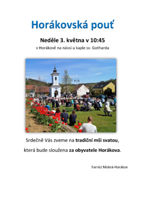 Srdečně Vás zveme na tradiční mši svatou, která se bude konat v neděli 3. května v 10:45 v Horákově na návsi u kaple sv. Gotharda.